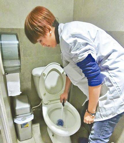 之后,唐宁做完水吧及楼面工作,更要洗厕所,她清洁男厕时表现无助,更向男同事求救:“从来没洗过男人小便池,请问小便池有没有冲厕的按钮,是不是同普通厕所一样要冲厕?”图为图为唐宁刷马桶。